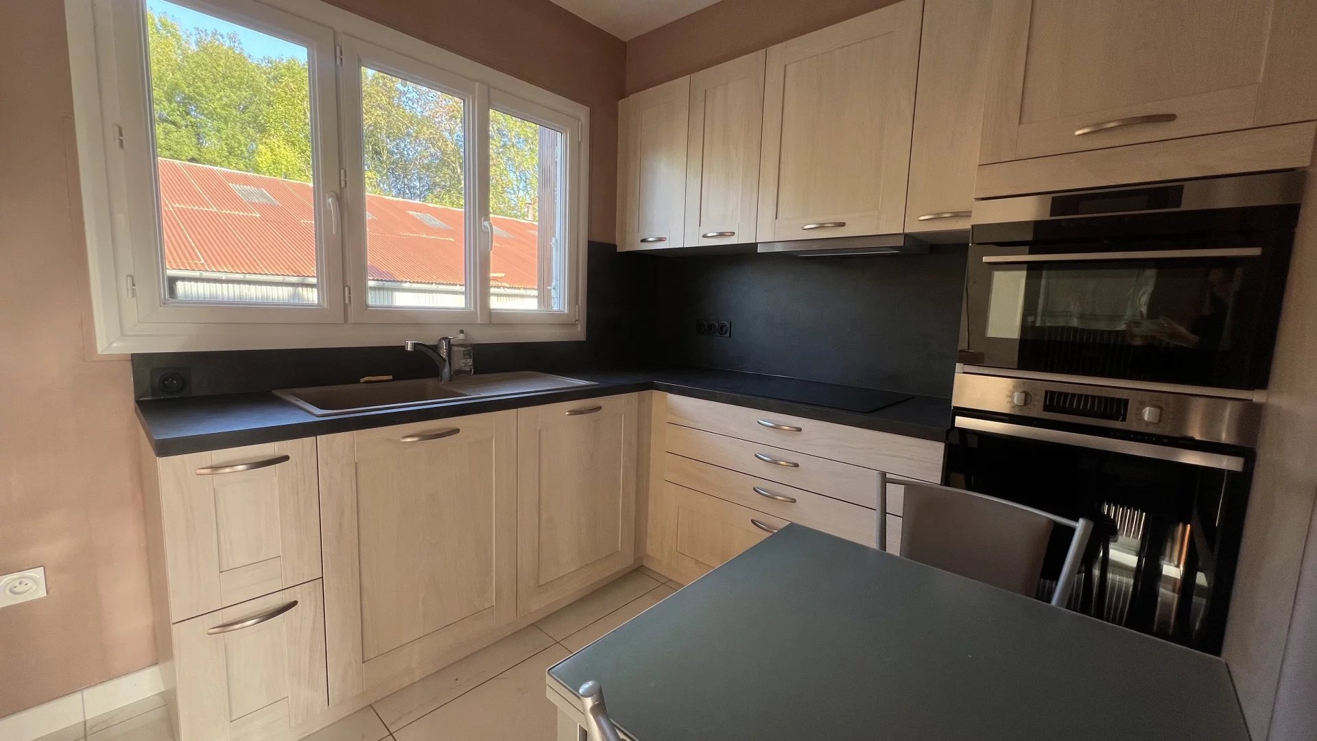 Maison de plain pied sur sous-sol total comprenant une entrée carrelée de 6m², une cuisine aménagée, équipée et carrelée de 6,84m², un séjour parqueté de 23,98m² avec accès à la terrasse, une salle de bain carrelée de 3,55m², 3 chambres parquetées de 9,15m², 10,18m² et 12,65m² ;