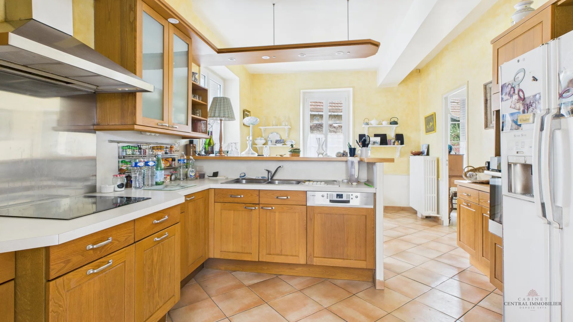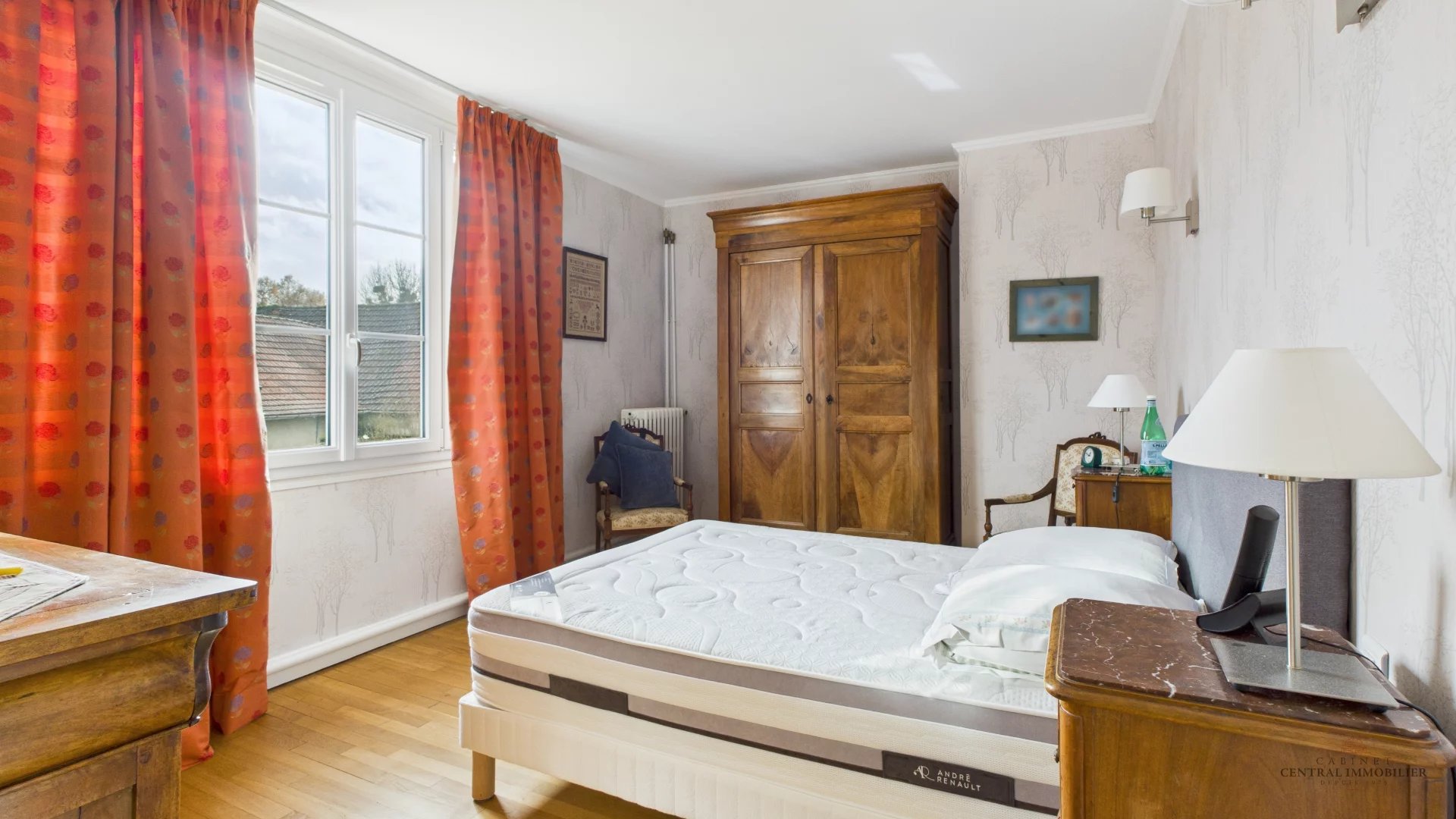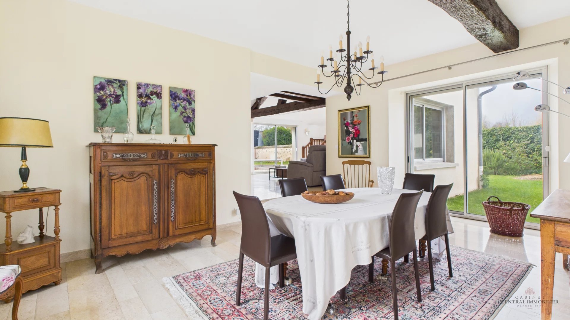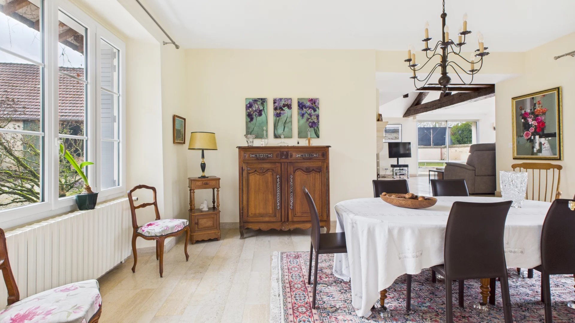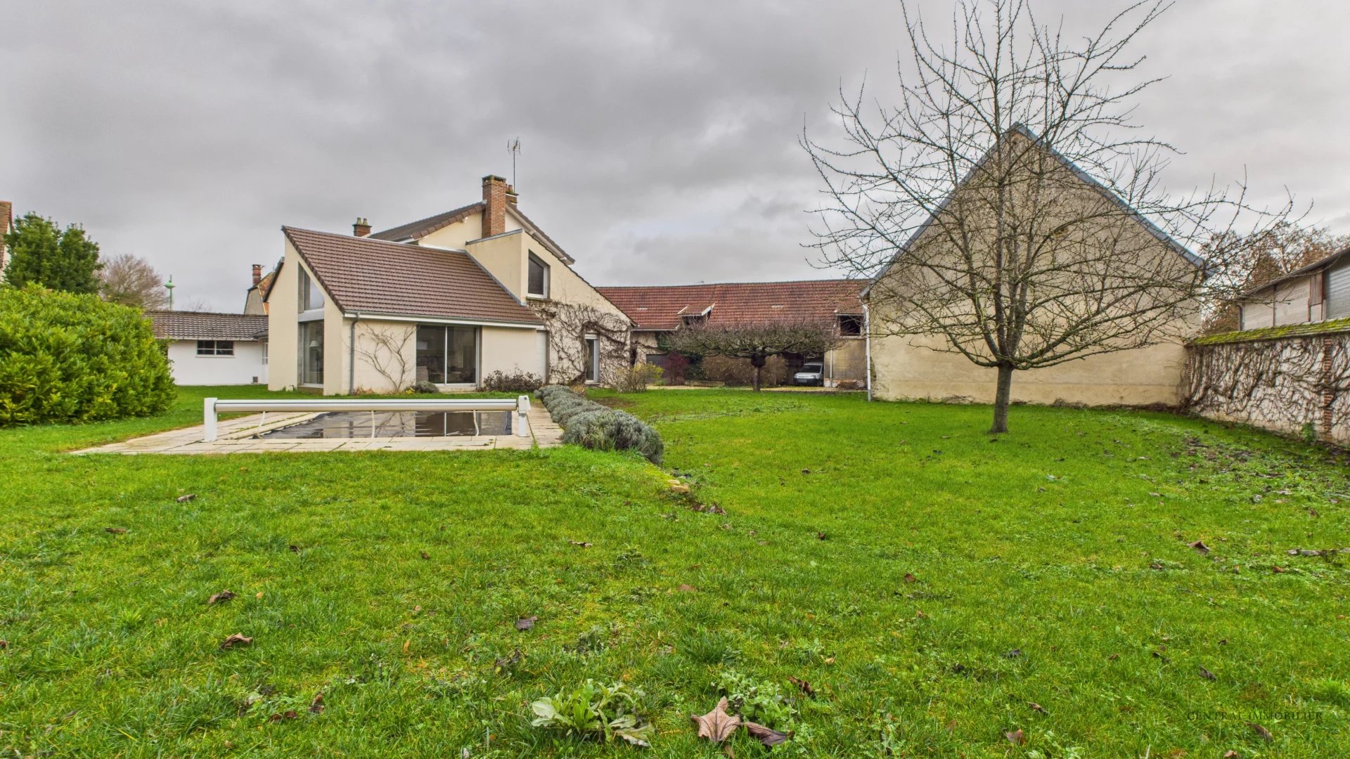 Maison comprenant : entrée de 12m² sol pierres de bourgogne avec placard et penderie, cuisine dinatoire de 20.80m² carrelée aménagée équipée accès véranda à usage d'arrière cuisine et buanderie, beau séjour salon de 75m² sol pierres de bourgogne avec baies vitrées et cheminée foyer ouvert, bureau de 4.70m² sol pierres de bourgogne, wc, salle d'eau (douche à l'italienne) sol pierres de bourgogne. À l'étage : palier parqueté, 3 chambres de 12.85m²/16m² et 16.20m² parquetées dont une avec 3 placards, chambre parentale de 13.50m² avec salle d'eau de 7m², wc. Mezzanine et une pièce grenier avec fenêtre. Chauffage central par PAC eau/eau. Double vitrage. Volets roulants électriques sur baies vitrées. Terrasse sol pierres avec préau et remise. Piscine enterrée et chauffée de 4x8. Chaufferie. Cave. Grange de 400m² environ avec 2 garages. Bureau indépendant. Portail motorisé. Agréable terrain clos de 1877m².