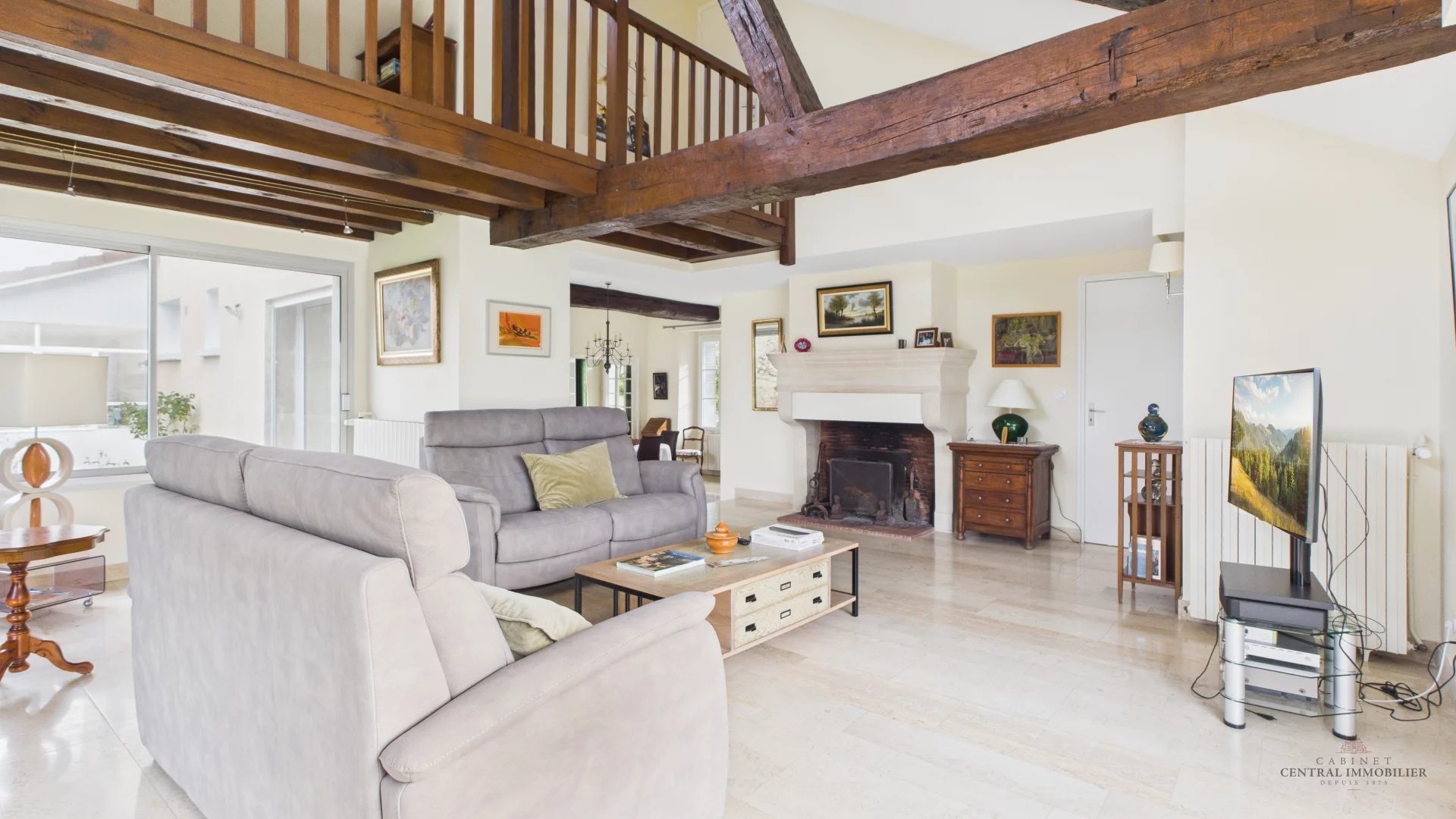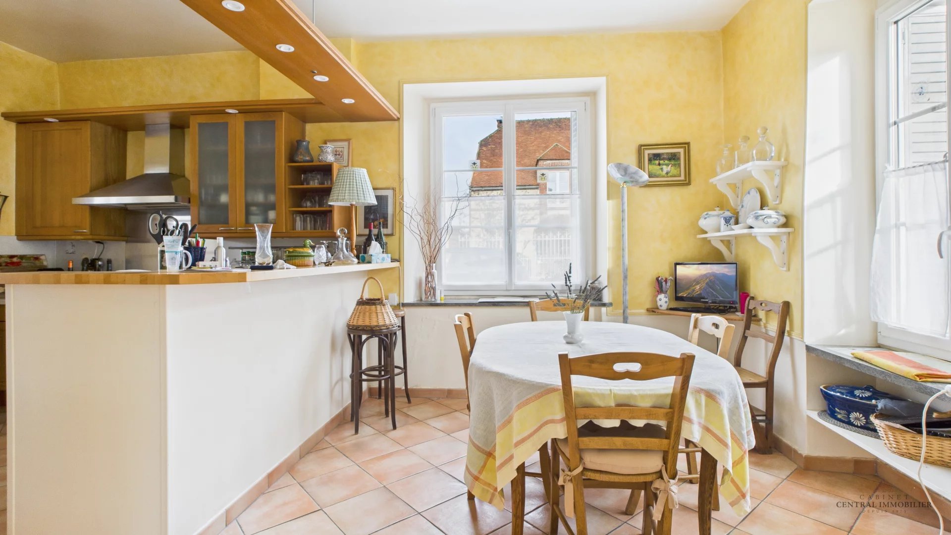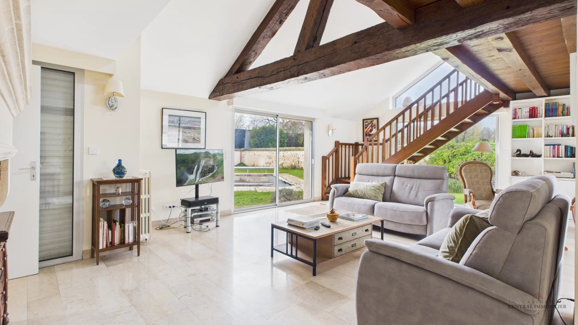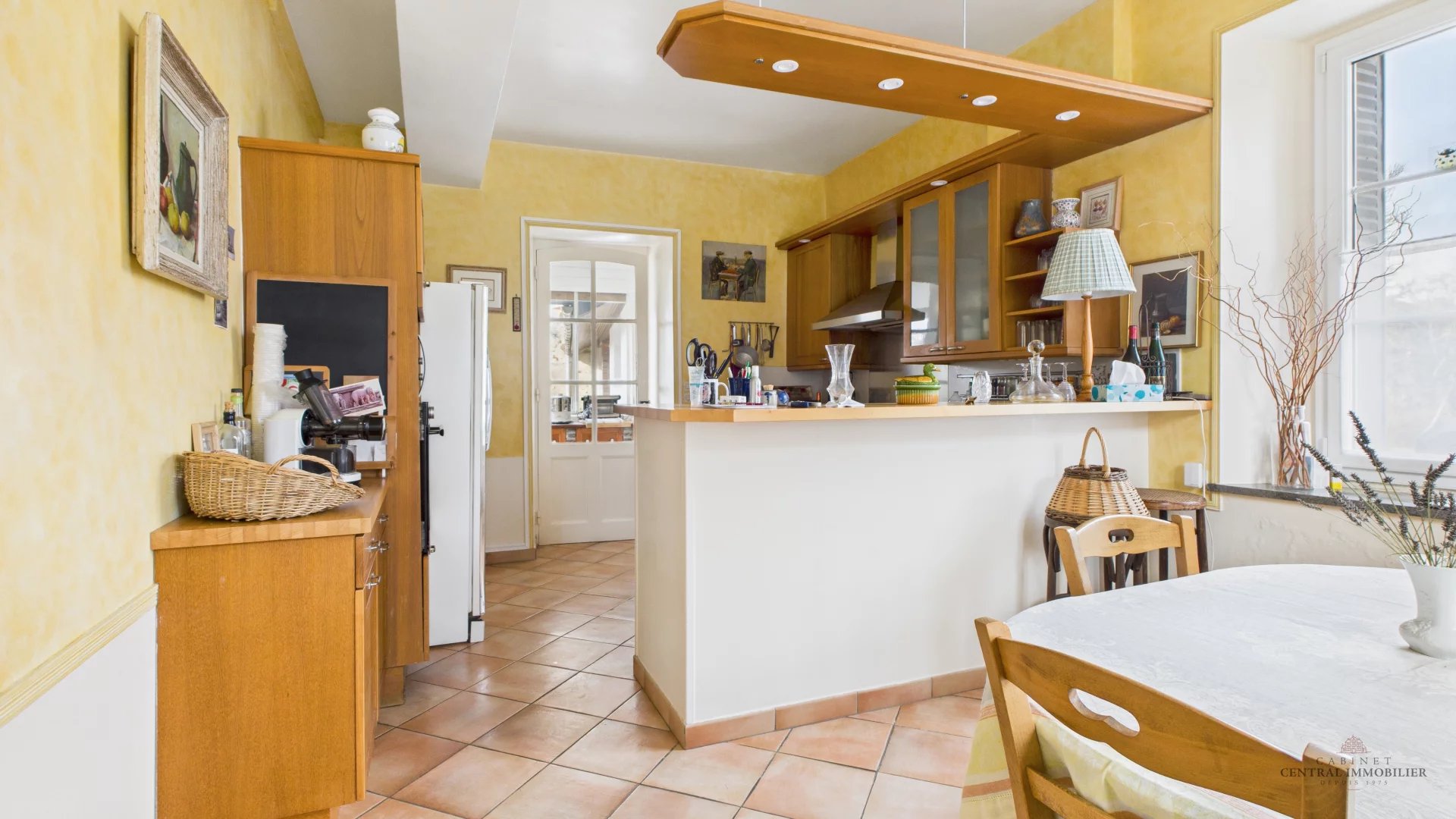 Maison comprenant : entrée de 12m² sol pierres de bourgogne avec placard et penderie, cuisine dinatoire de 20.80m² carrelée aménagée équipée accès véranda à usage d'arrière cuisine et buanderie, beau séjour salon de 75m² sol pierres de bourgogne avec baies vitrées et cheminée foyer ouvert, bureau de 4.70m² sol pierres de bourgogne, wc, salle d'eau (douche à l'italienne) sol pierres de bourgogne. À l'étage : palier parqueté, 3 chambres de 12.85m²/16m² et 16.20m² parquetées dont une avec 3 placards, chambre parentale de 13.50m² avec salle d'eau de 7m², wc. Mezzanine et une pièce grenier avec fenêtre. Chauffage central par PAC eau/eau. Double vitrage. Volets roulants électriques sur baies vitrées. Terrasse sol pierres avec préau et remise. Piscine enterrée et chauffée de 4x8. Chaufferie. Cave. Grange de 400m² environ avec 2 garages. Bureau indépendant. Portail motorisé. Agréable terrain clos de 1877m².