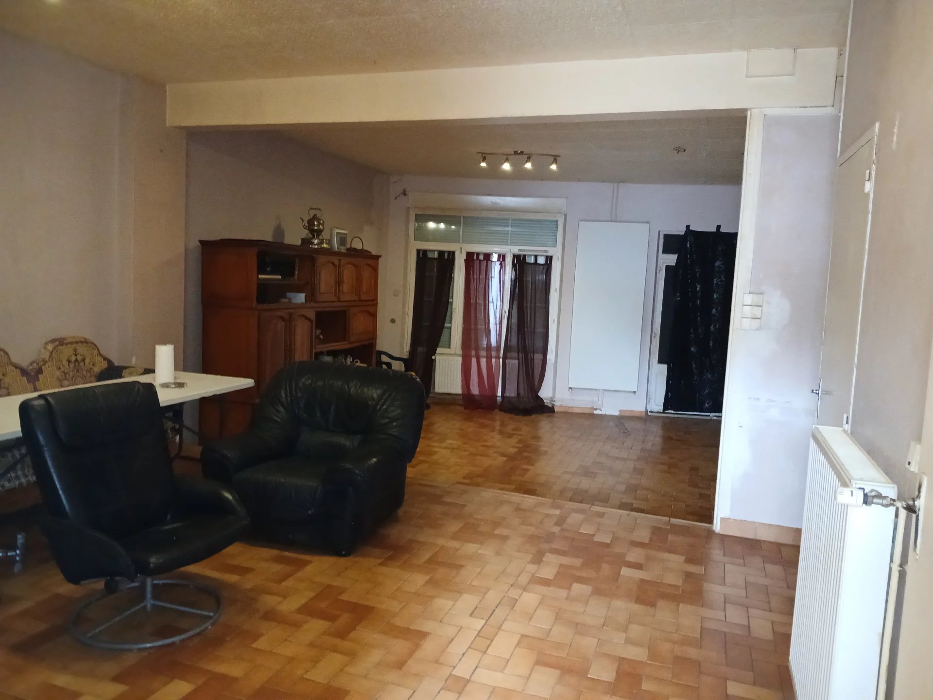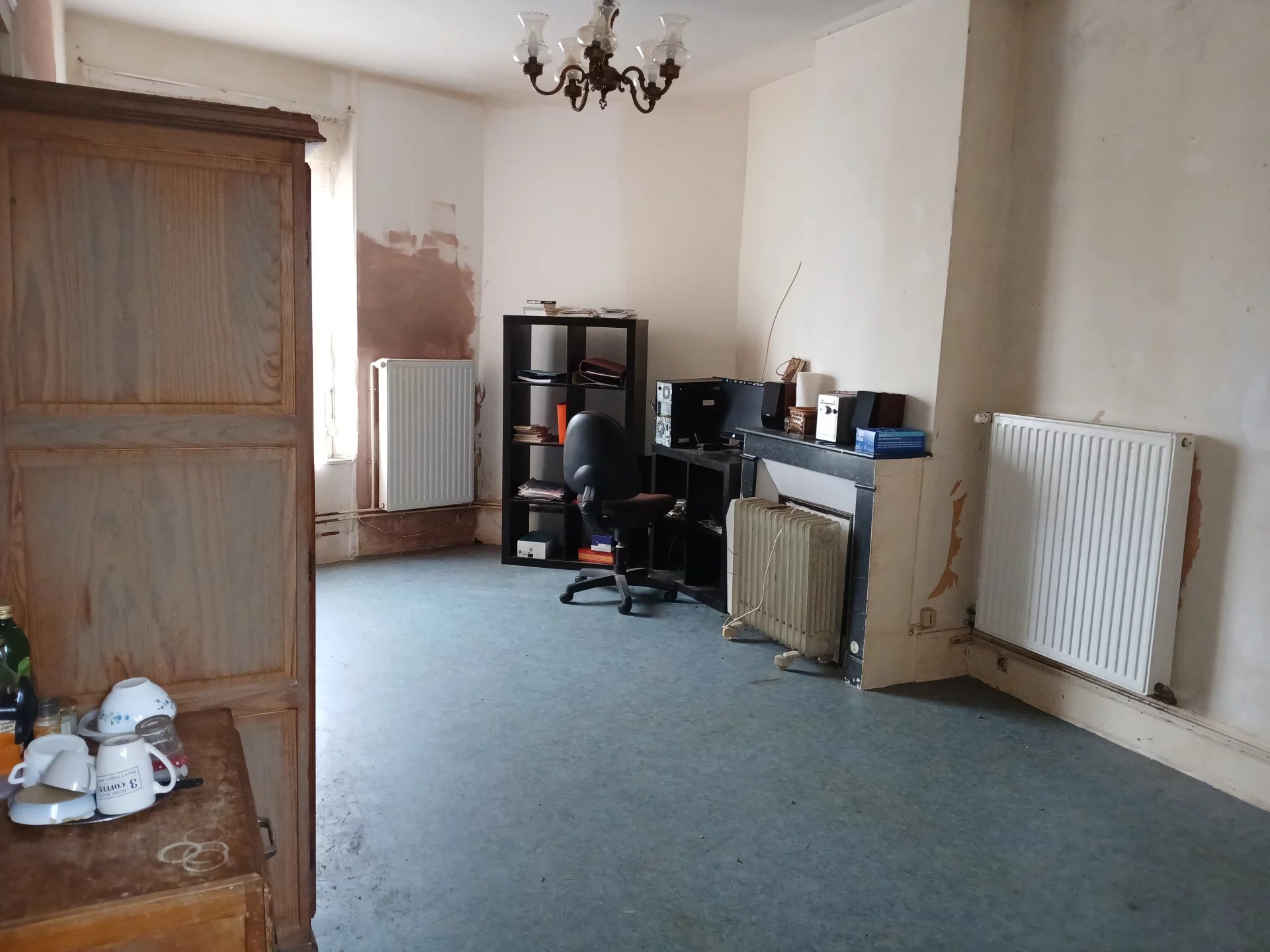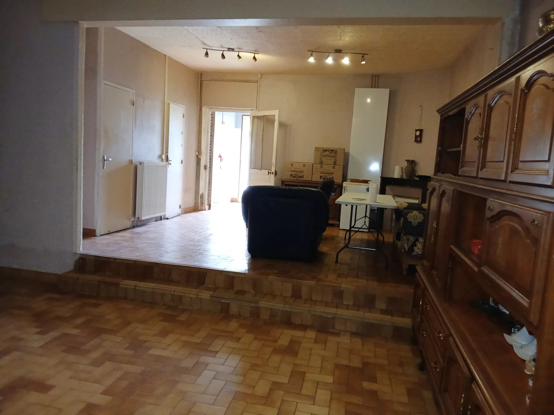 Maison comprenant : 3 entrées, cuisine carrelée de 8.30m², pièce de vie carrelée avec cheminée décorative 43,80m², wc carrelé avec lave mains. À l'étage : pièce palière carrelée de 12m² avec petit grenier, 2 chambres sol moquette avec cheminées décoratives de 16,40m² et 19,30m², salle de bains carrelée avec wc de 6.20m². Installation chauffage central gaz de ville (chaudière hors service). Fenêtres en double et simple vitrage. Volets roulants électriques et manuels. Cave. Grand garage. Charpente à vérifier. Terrain clos de 207m².