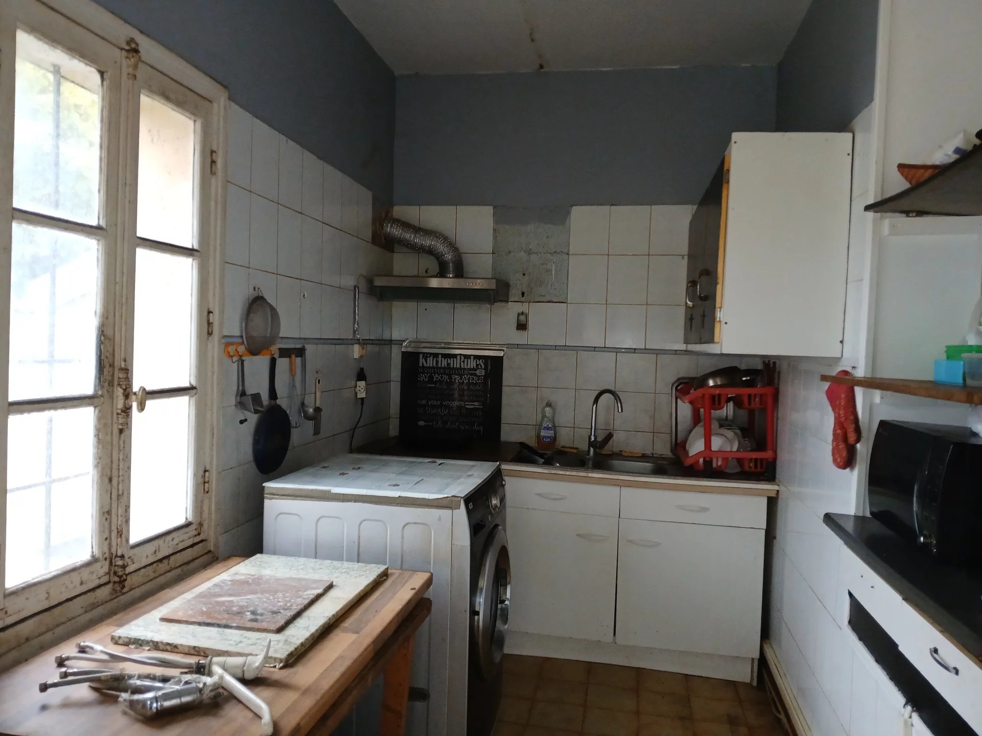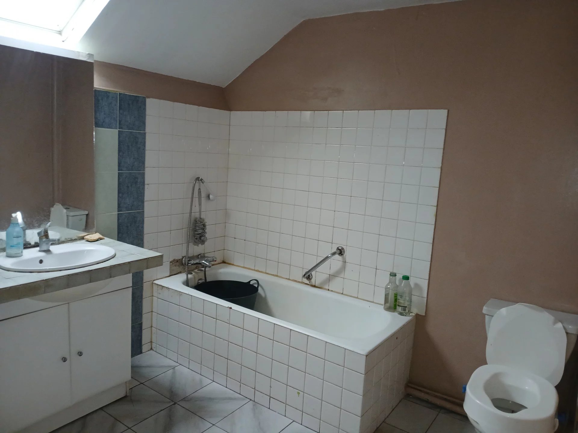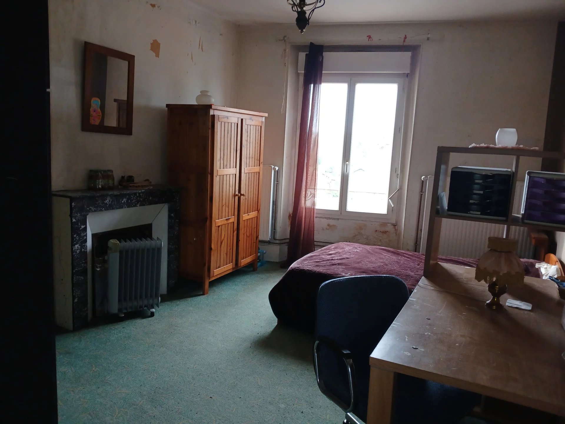 Maison comprenant : 3 entrées, cuisine carrelée de 8.30m², pièce de vie carrelée avec cheminée décorative 43,80m², wc carrelé avec lave mains. À l'étage : pièce palière carrelée de 12m² avec petit grenier, 2 chambres sol moquette avec cheminées décoratives de 16,40m² et 19,30m², salle de bains carrelée avec wc de 6.20m². Installation chauffage central gaz de ville (chaudière hors service). Fenêtres en double et simple vitrage. Volets roulants électriques et manuels. Cave. Grand garage. Charpente à vérifier. Terrain clos de 207m².
